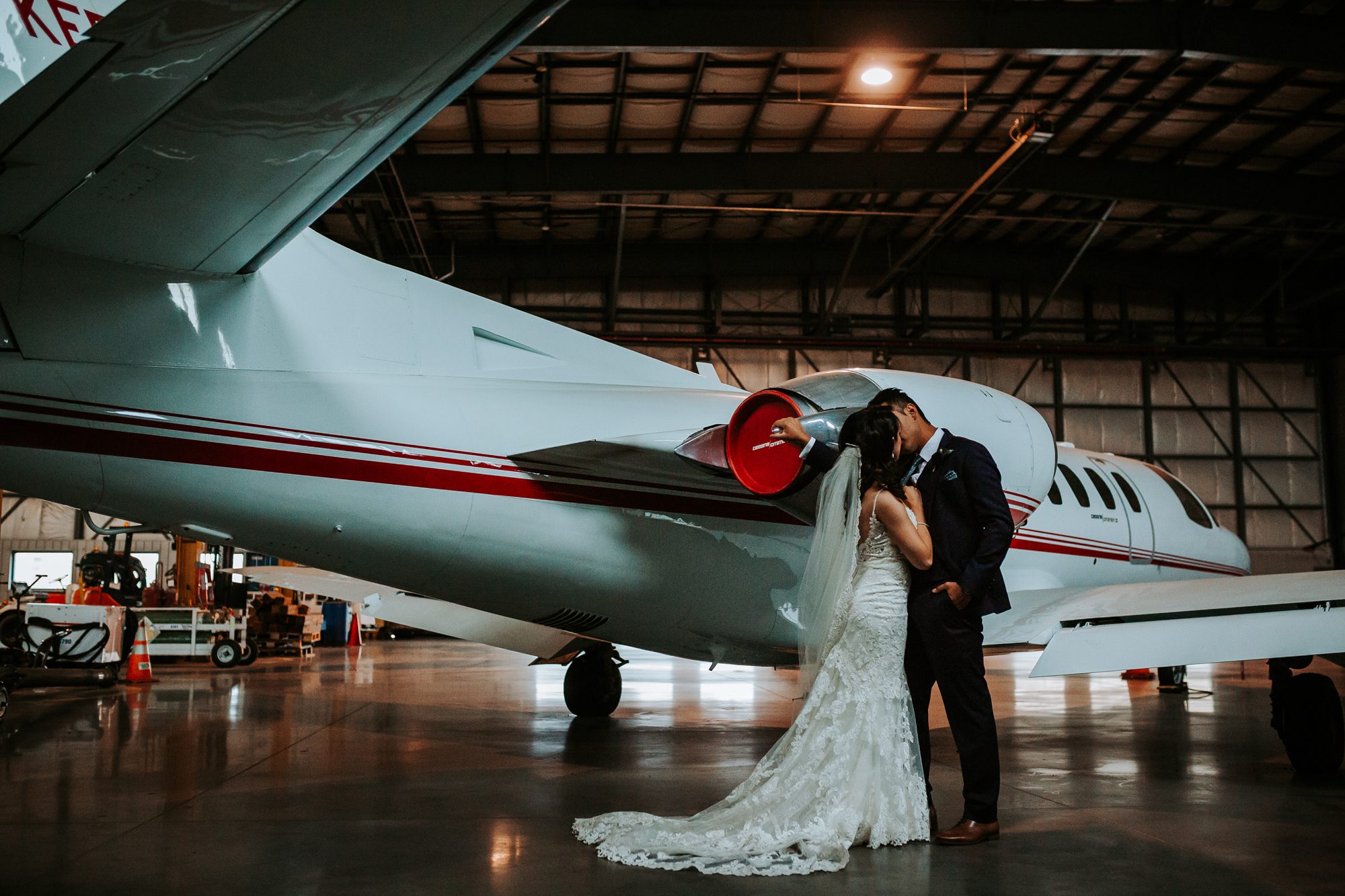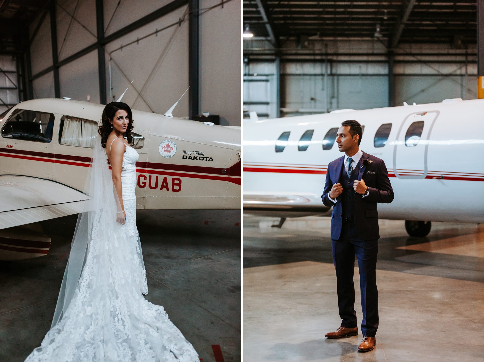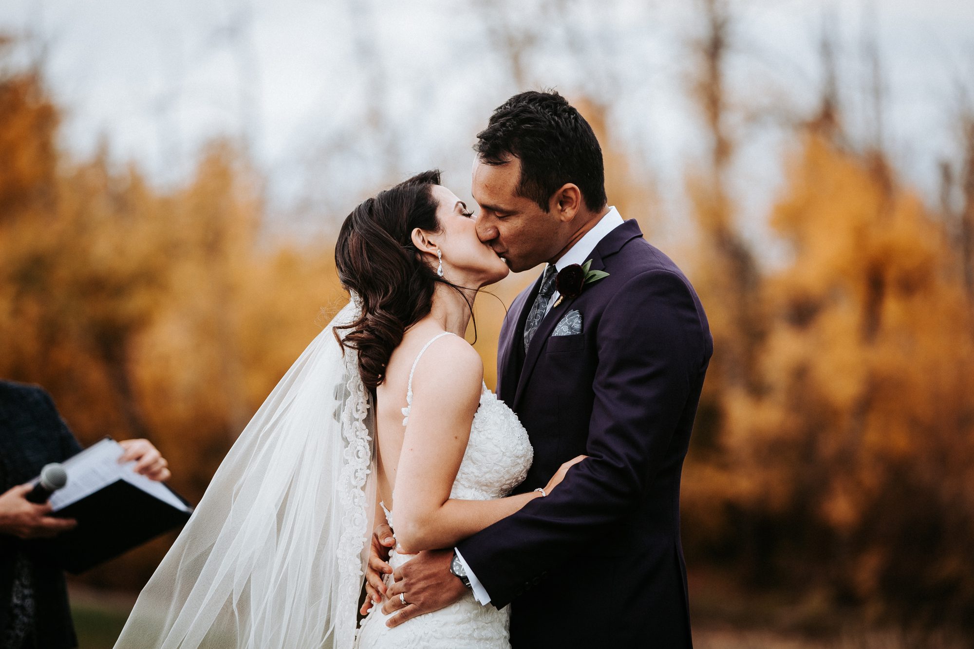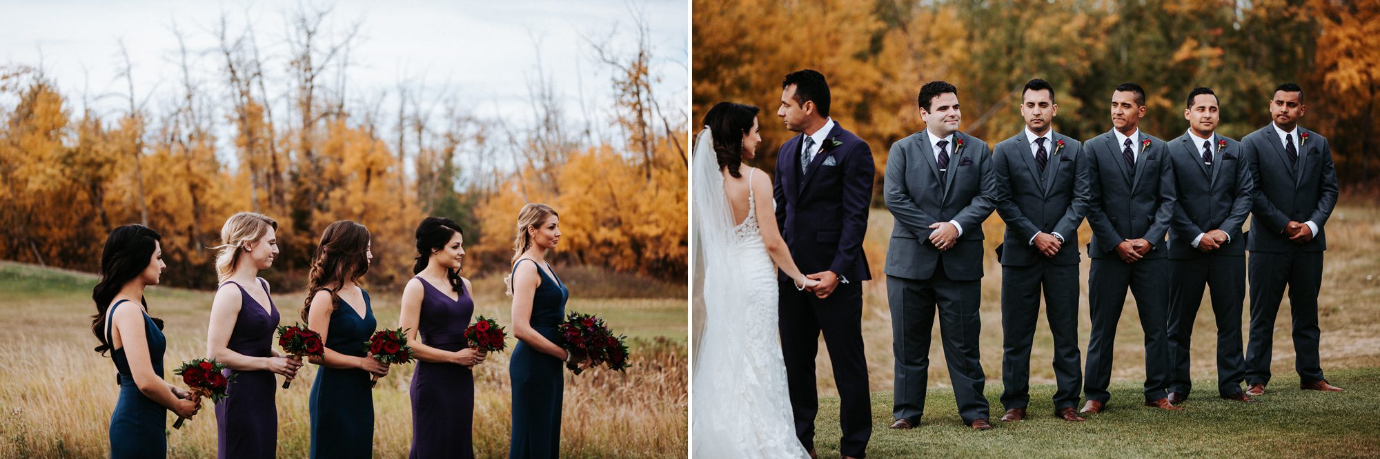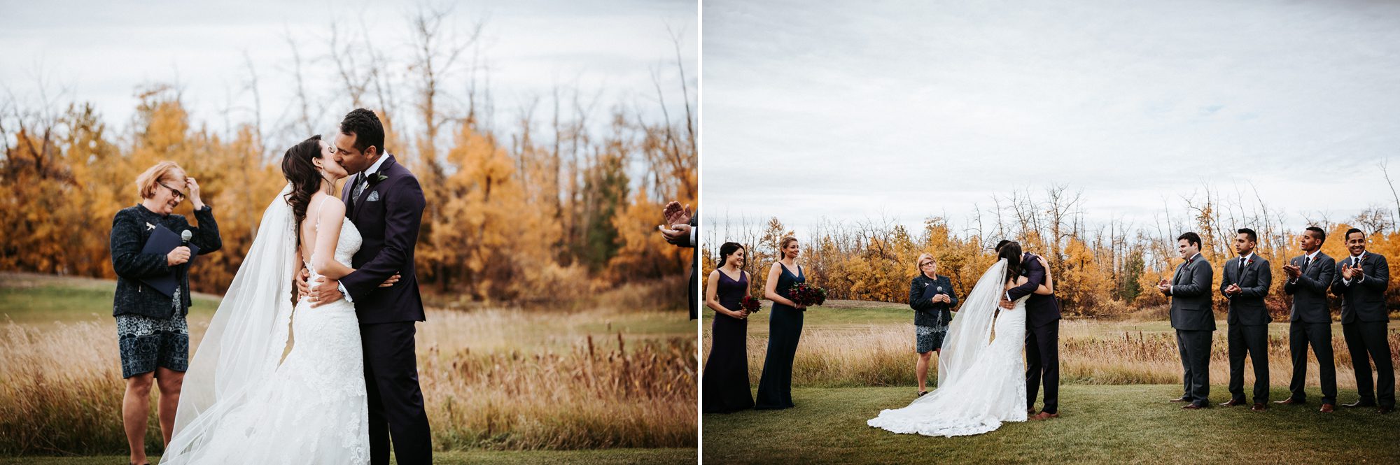 Alyx and Alex were married on September 30th, 2017 on a beautiful fall afternoon at RedTail Landing Golf Club, surrounded by their loved ones. After their ceremony and family photos we headed out to our first formals location inside an airplane hangar. We had to wait though, for the Oilers hockey team to take off before doing any photos. As soon as the groomsmen saw players from the hockey team pull in to board, I believe their days were made. The groom most of all was the most ecstatic, and I remember the bride saying “Nevermind us getting married, this will be the highlight of his life” lol! Once we finished at the hangar we headed to our second location with some beautiful fall colors and a view of the river. Their reception was also held at the RedTail Landing Gold Club. What a fantastic day!