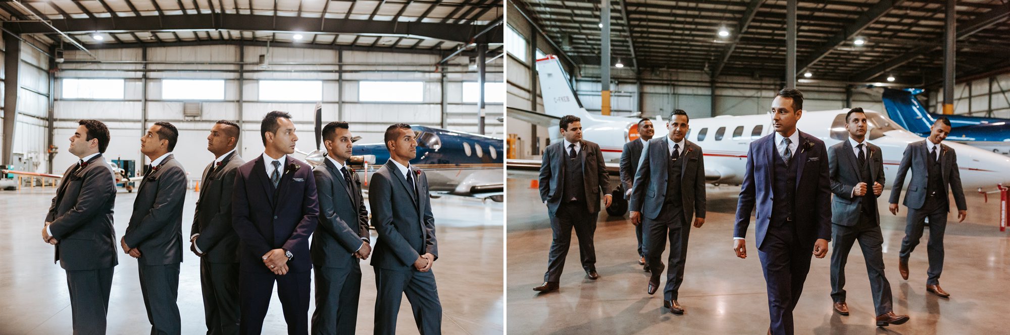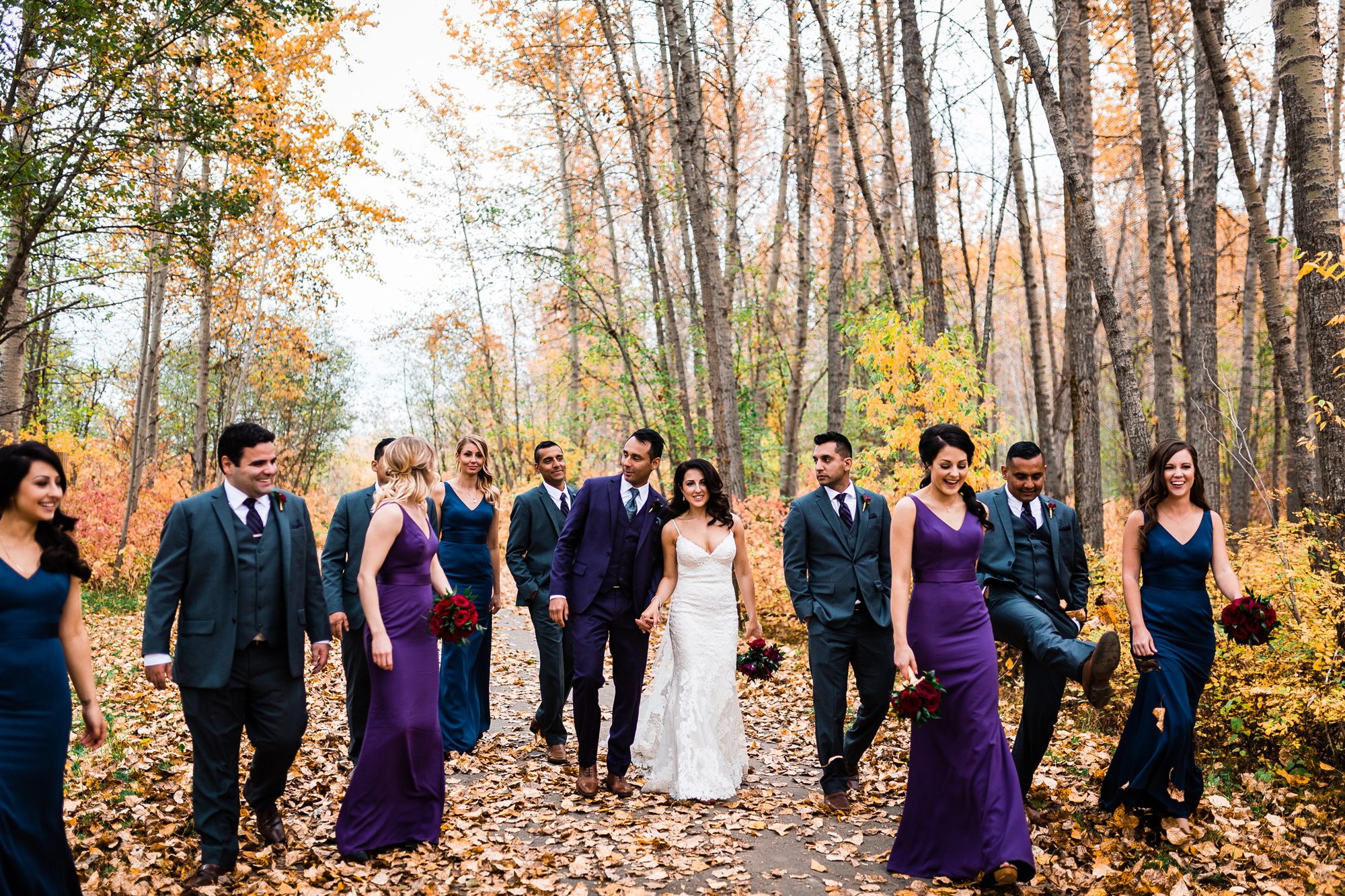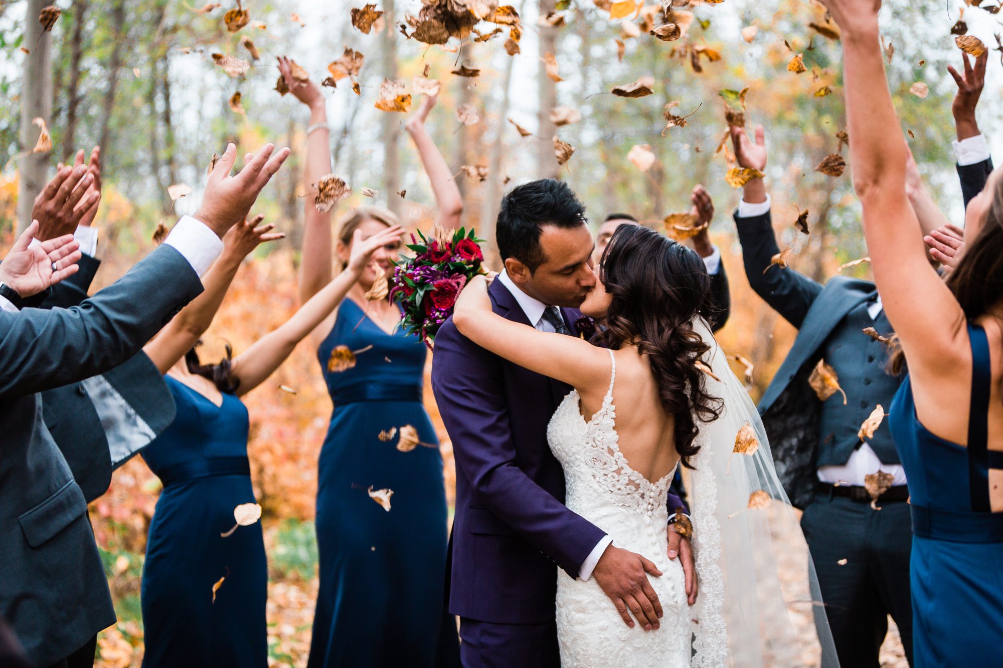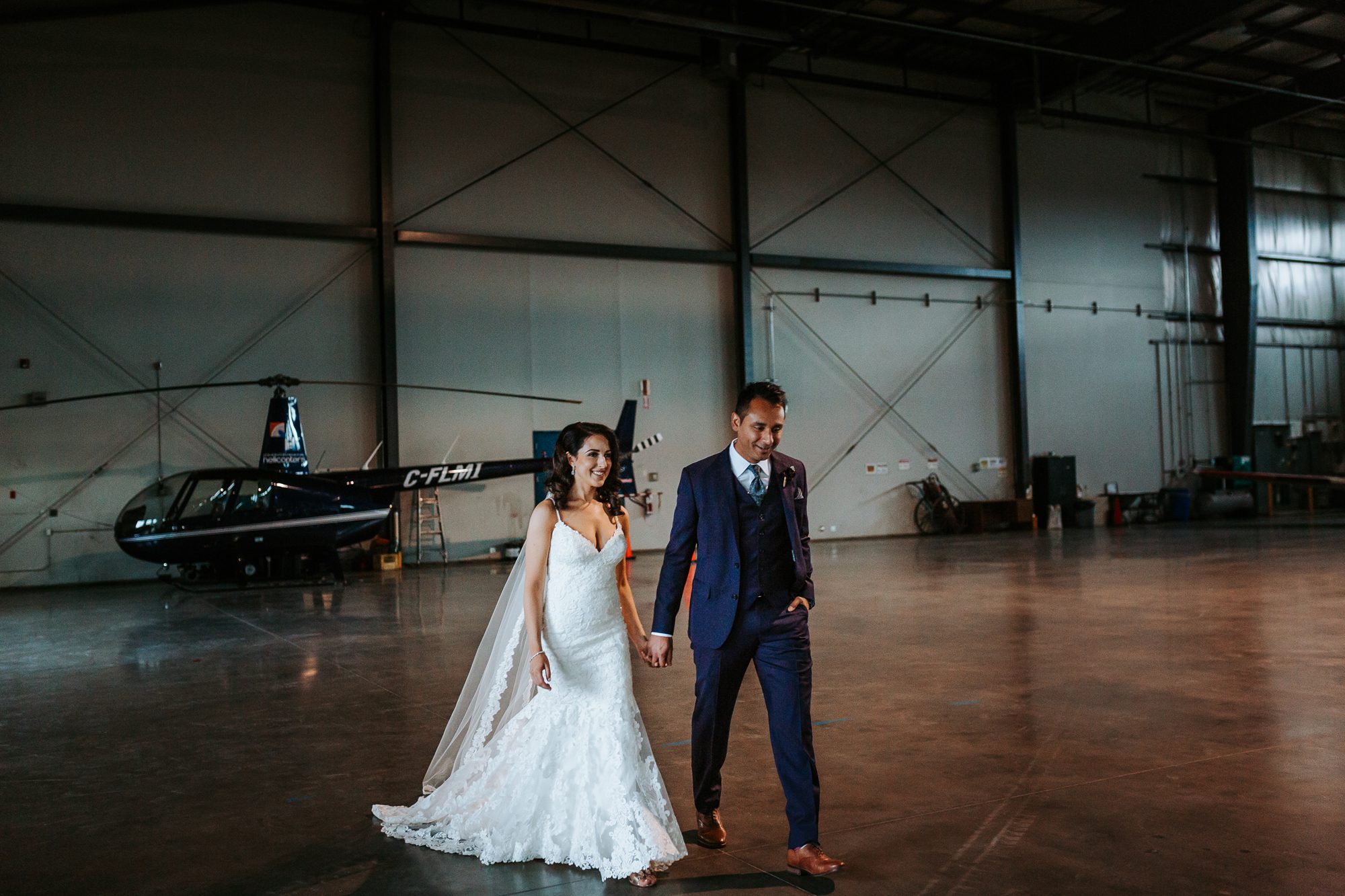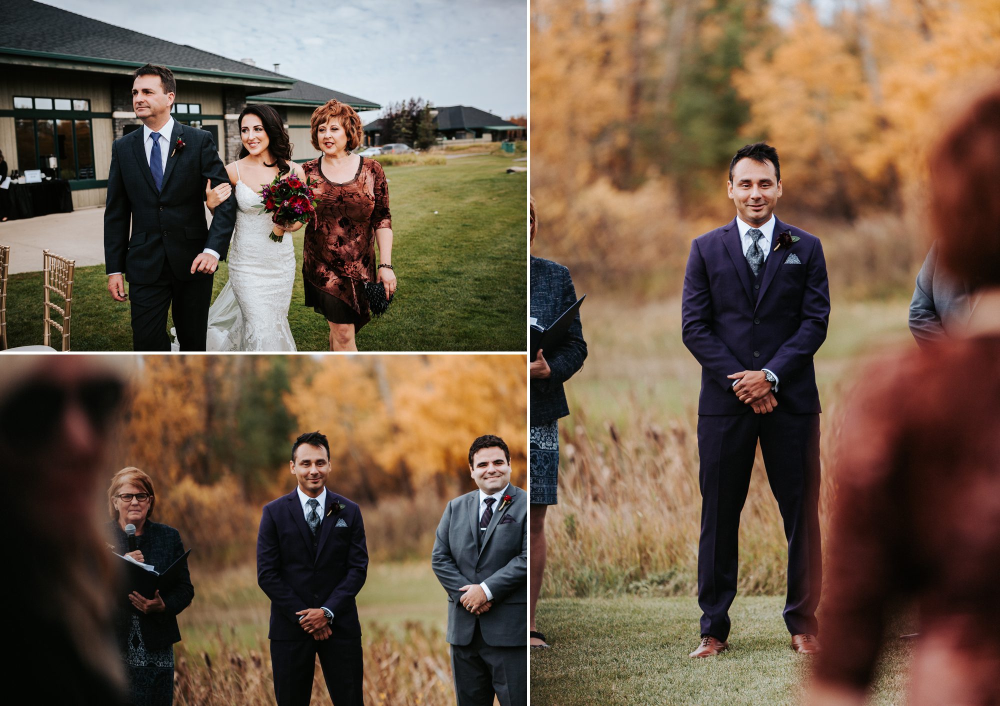 Alyx and Alex were married on September 30th, 2017 on a beautiful fall afternoon at RedTail Landing Golf Club, surrounded by their loved ones. After their ceremony and family photos we headed out to our first formals location inside an airplane hangar. We had to wait though, for the Oilers hockey team to take off before doing any photos. As soon as the groomsmen saw players from the hockey team pull in to board, I believe their days were made. The groom most of all was the most ecstatic, and I remember the bride saying “Nevermind us getting married, this will be the highlight of his life” lol! Once we finished at the hangar we headed to our second location with some beautiful fall colors and a view of the river. Their reception was also held at the RedTail Landing Gold Club. What a fantastic day!