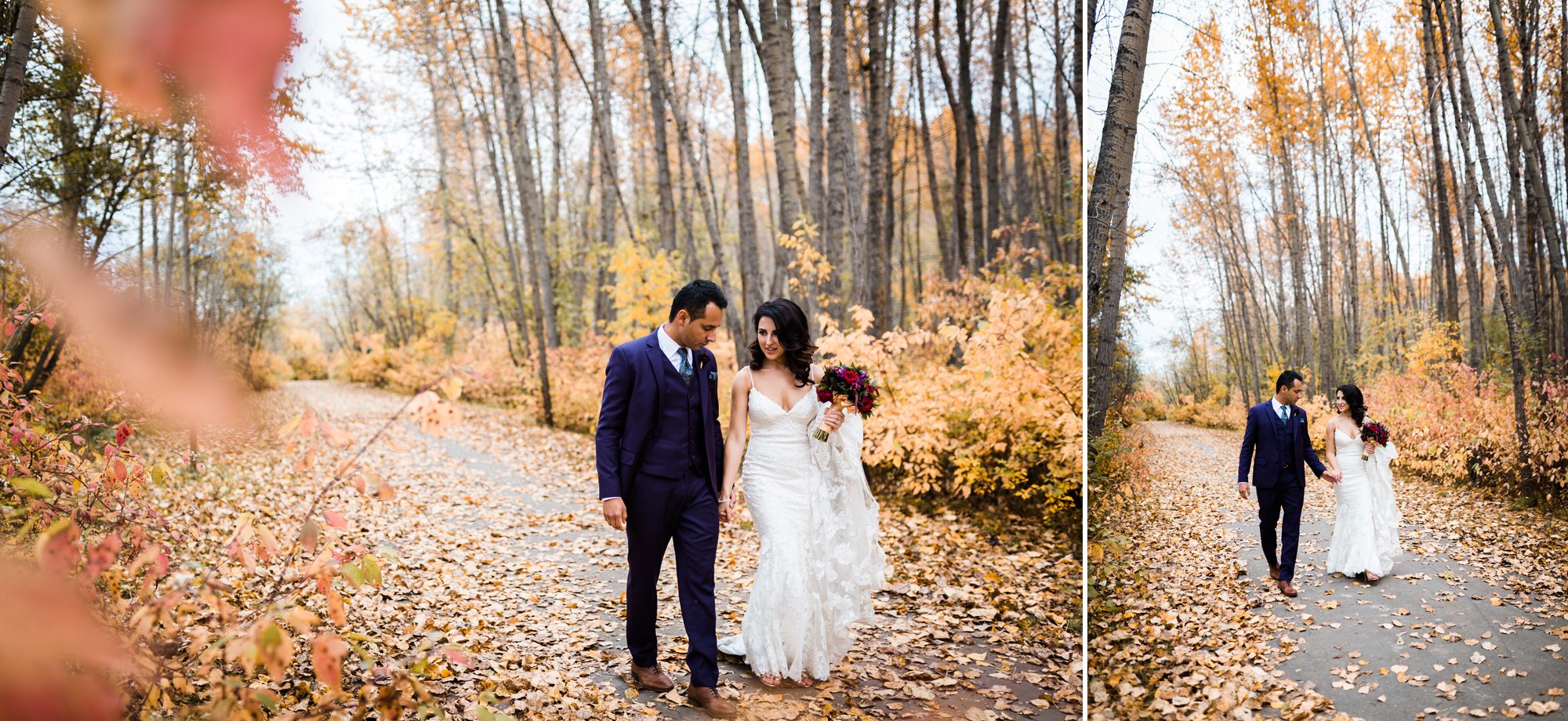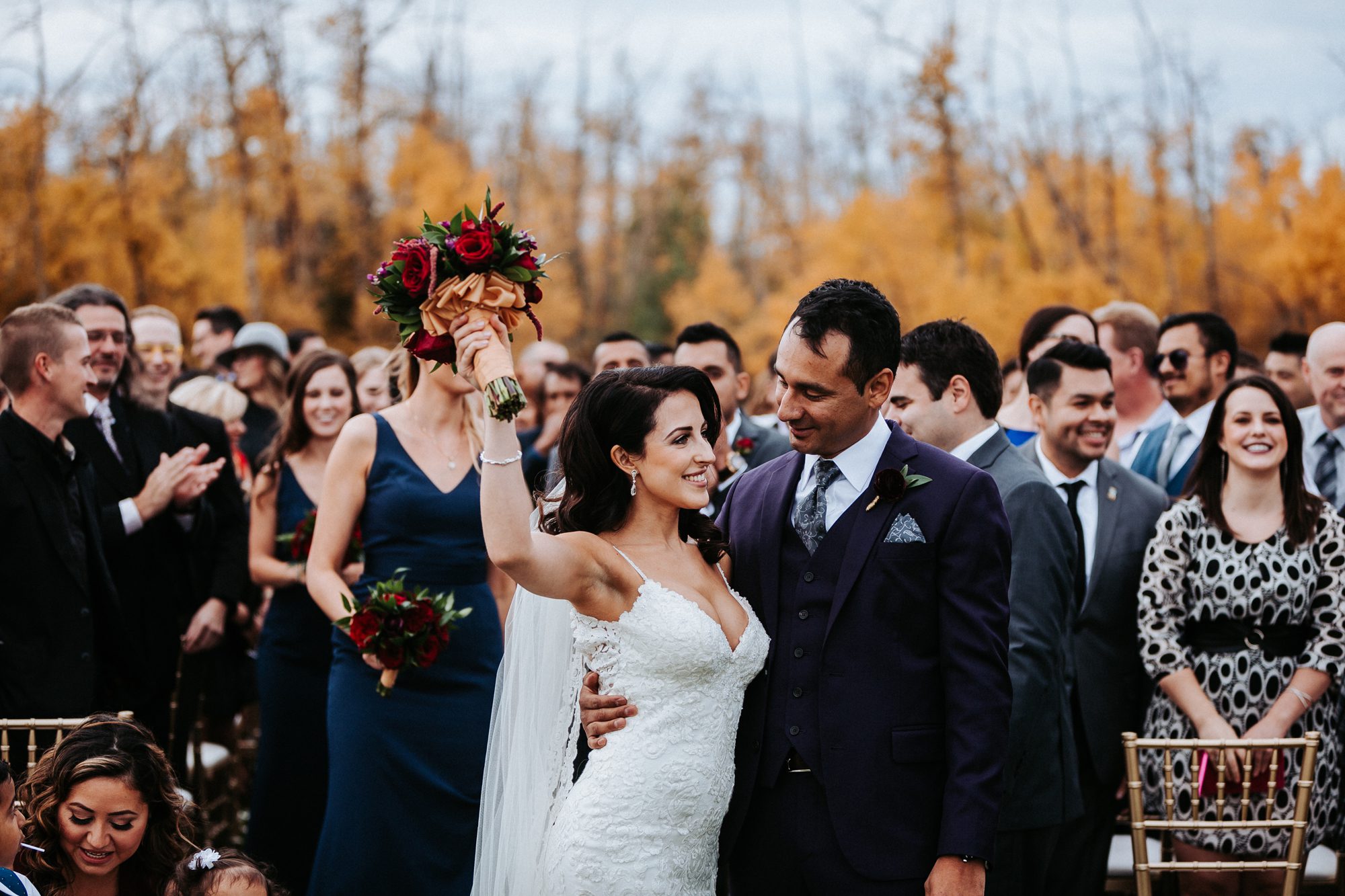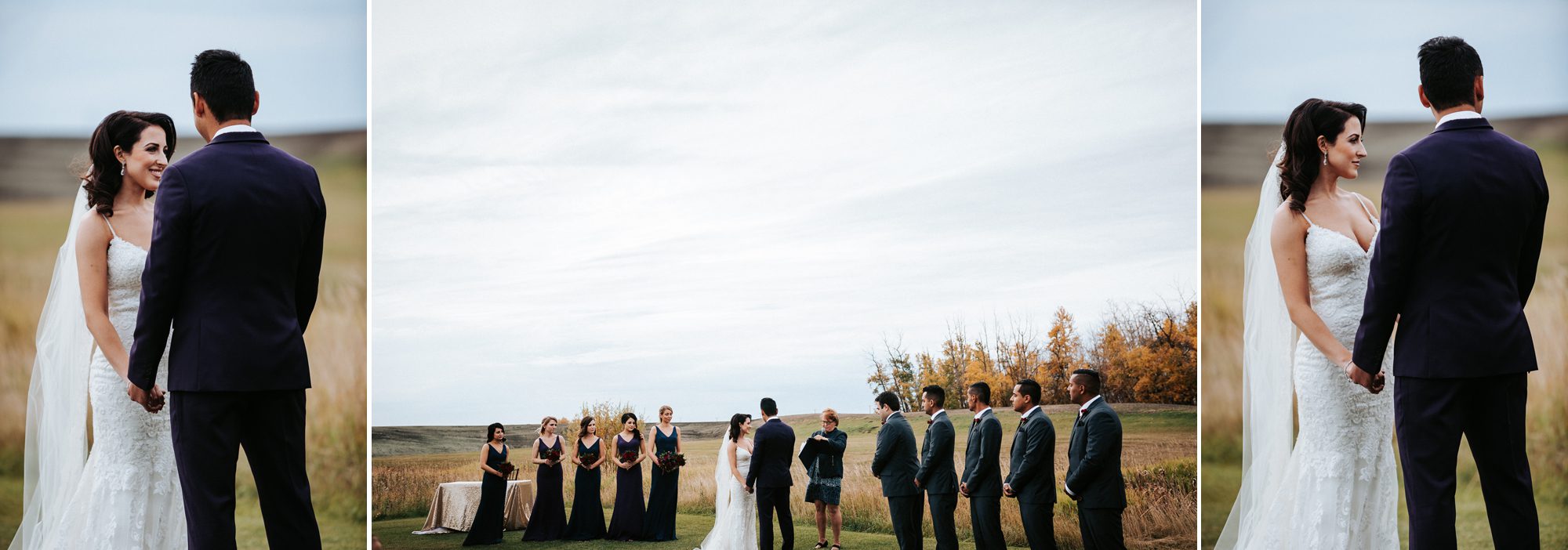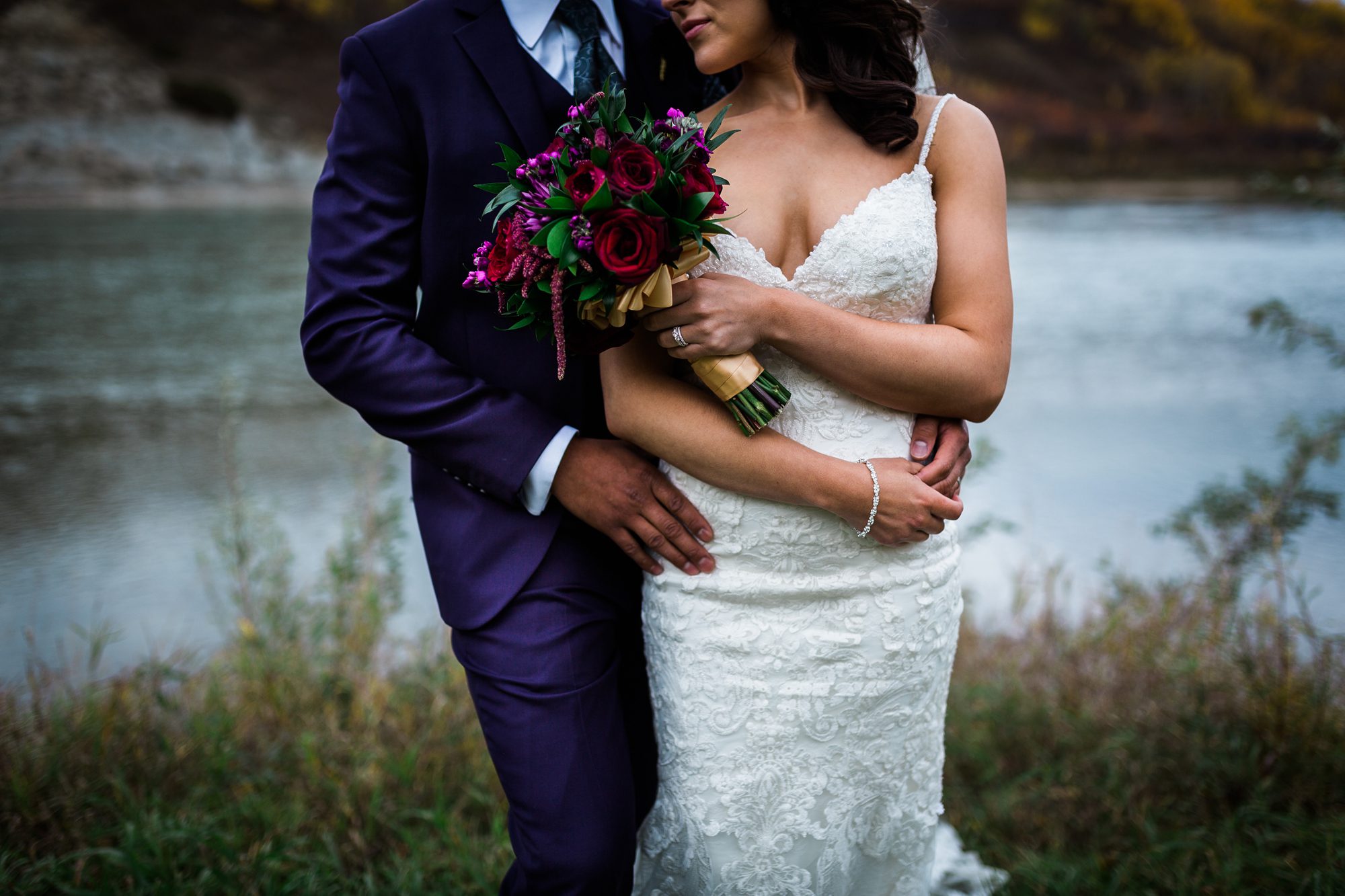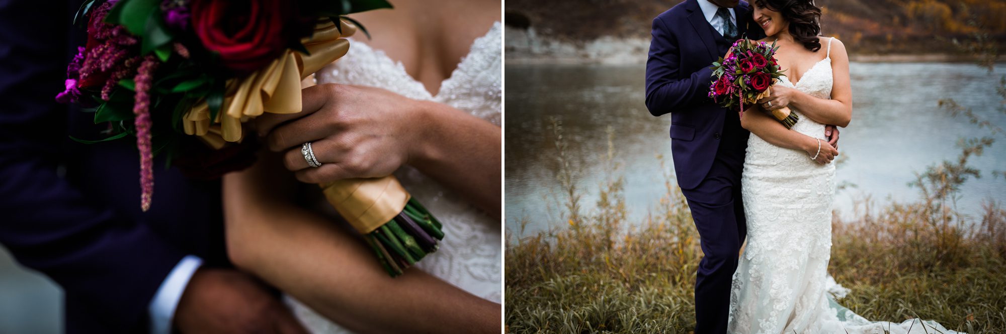 Alyx and Alex were married on September 30th, 2017 on a beautiful fall afternoon at RedTail Landing Golf Club, surrounded by their loved ones. After their ceremony and family photos we headed out to our first formals location inside an airplane hangar. We had to wait though, for the Oilers hockey team to take off before doing any photos. As soon as the groomsmen saw players from the hockey team pull in to board, I believe their days were made. The groom most of all was the most ecstatic, and I remember the bride saying “Nevermind us getting married, this will be the highlight of his life” lol! Once we finished at the hangar we headed to our second location with some beautiful fall colors and a view of the river. Their reception was also held at the RedTail Landing Gold Club. What a fantastic day!