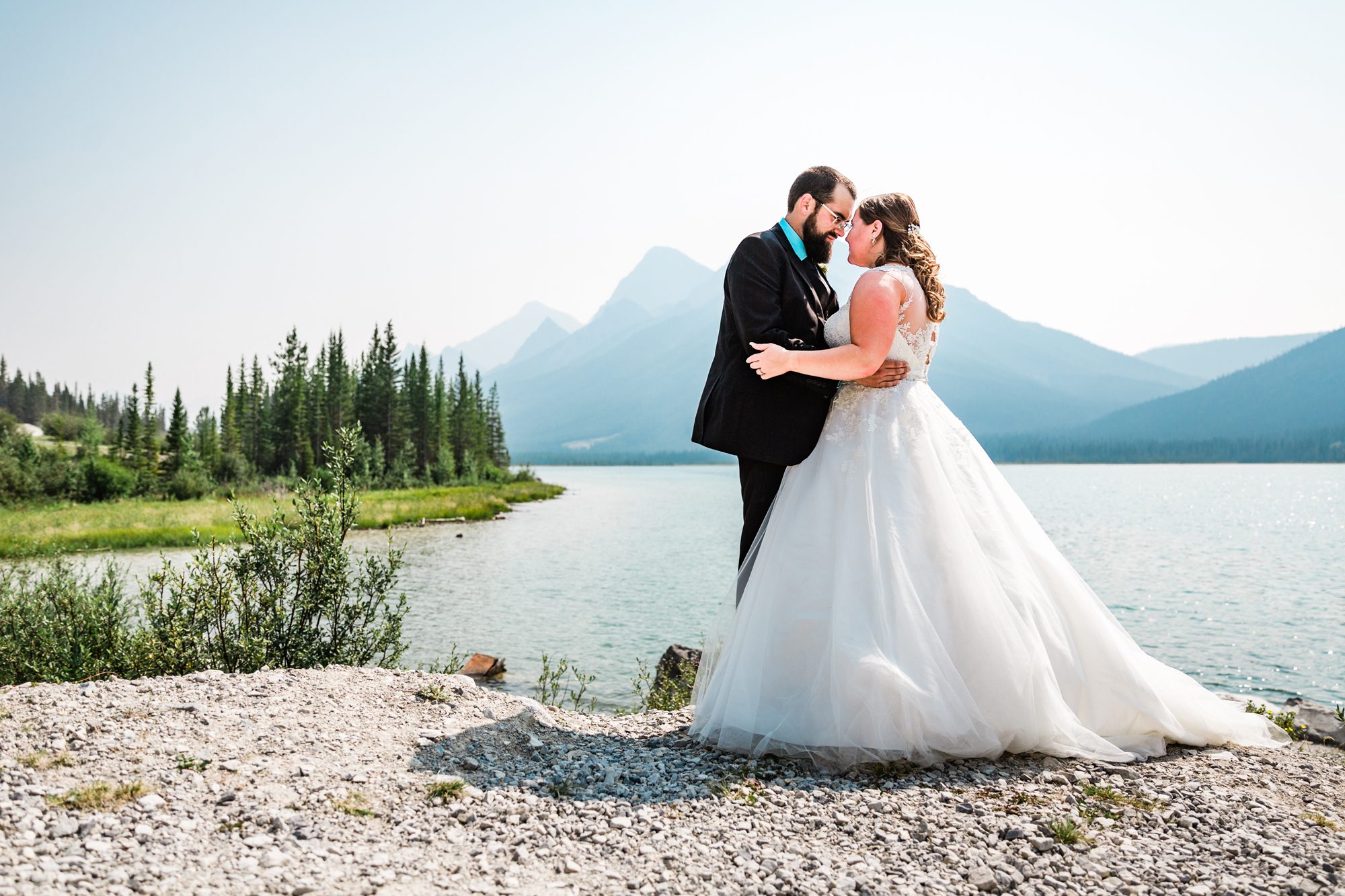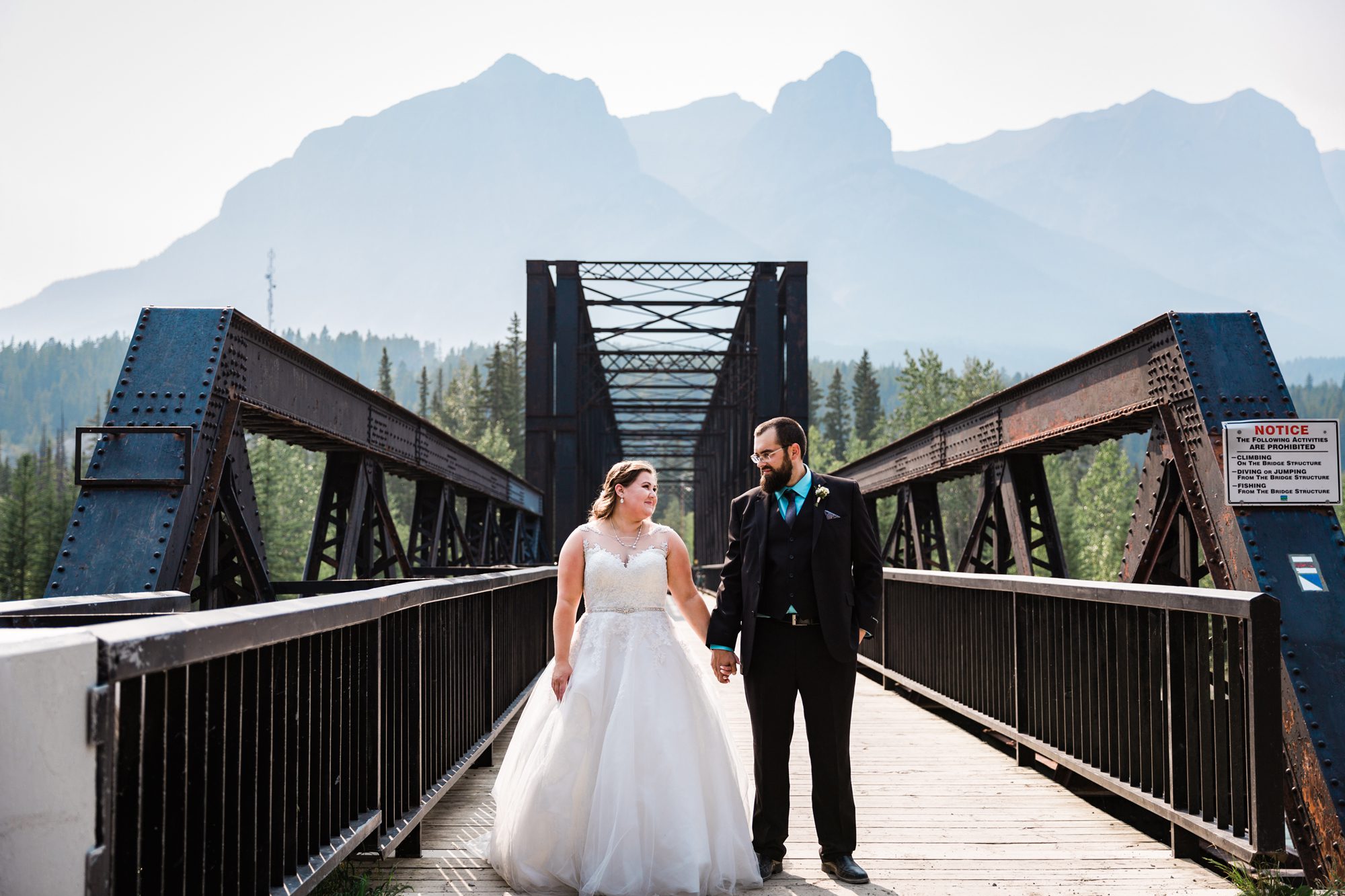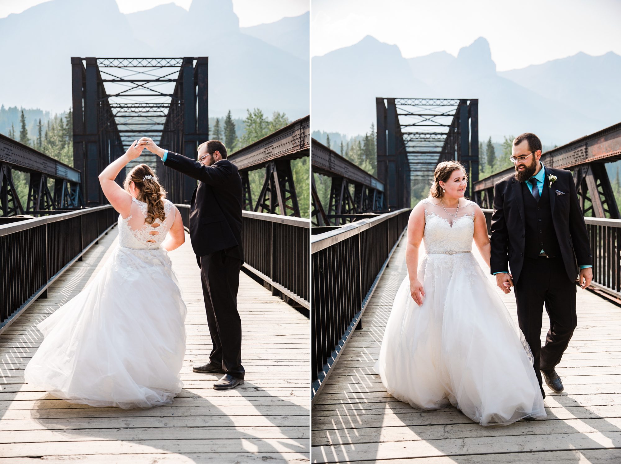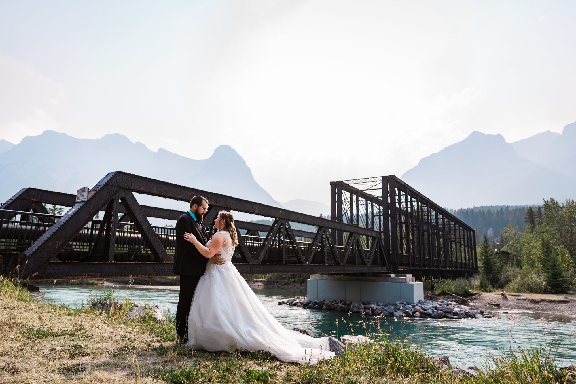 I’ve known Rachelle for many, many years. Like over 12 years! Probably more. So it was really such an honor to have photographed her intimate wedding in Canmore. Garrett and Rachelle were married in front of their close friends and family in Rundleview Park in Canmore Alberta. It was one of the hottest (if not the hottest) day of the year. I think my vehicle was registering between 36.5-37 Degrees Celsius by the time we started the ceremony. It was also pretty smoky due to the fires burning in BC this summer, but Rachelle and Garrett took these circumstances with stride. I was happy we could see the mountains, and that it wasn’t as bad as we had all originally thought it would be. After their ceremony and some family photos, we headed to the first formals location just south west of Canmore, then to Whitemans Pond, and then to the Engine Bridge. It was such a good day! I’m so excited for the future of Rachelle and Garrett, I wish them nothing but the best in their new life together.